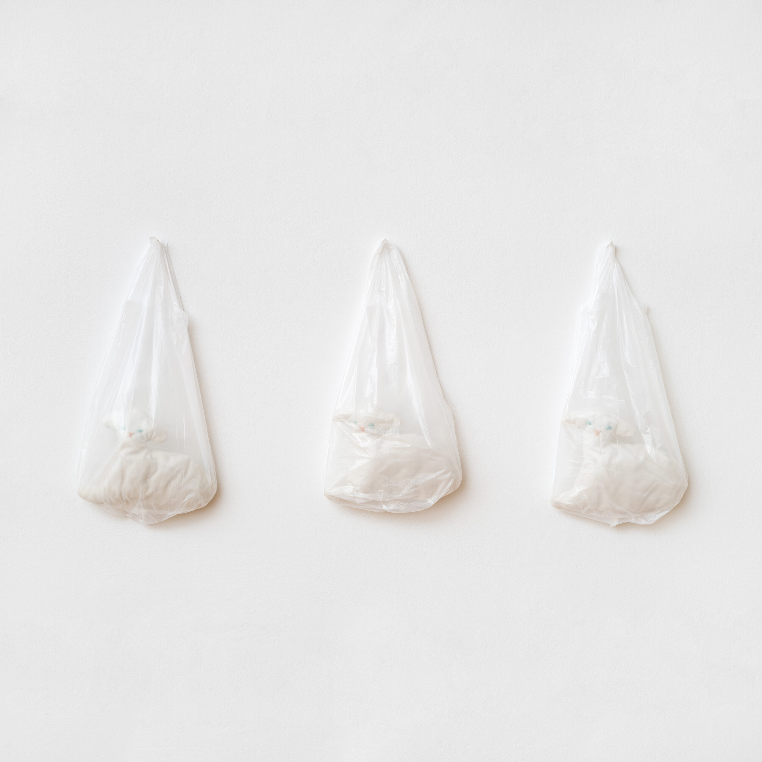 13 Lambs is an ongoing installation series that started 2014/2015. The 13 Lambs installations contain 13 hand sewed velvet lambs in plastic bags and a 14th bag containing production waste from the 13 Lambs production. The 14th bag is a reference to the way we as a society treat animals.