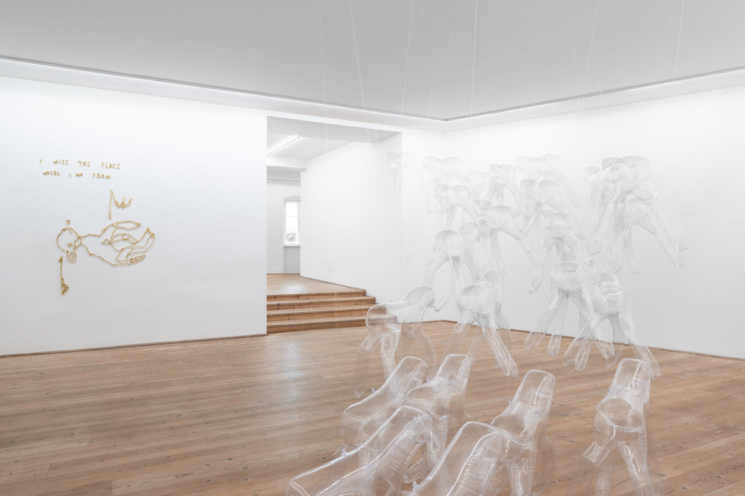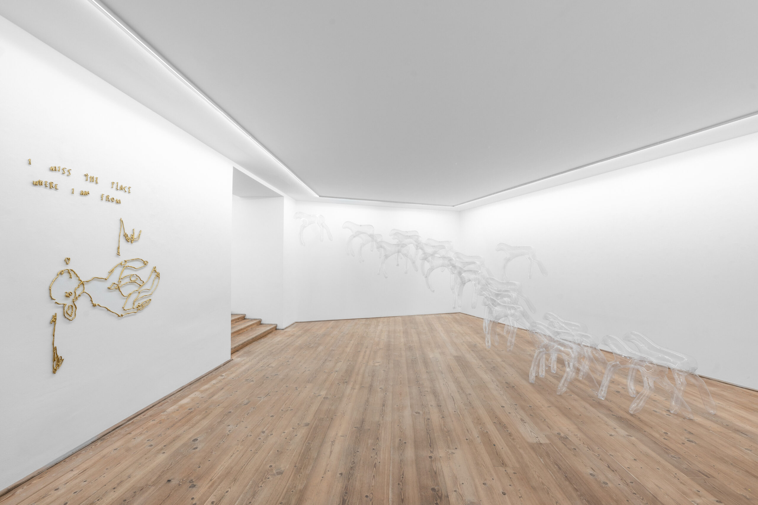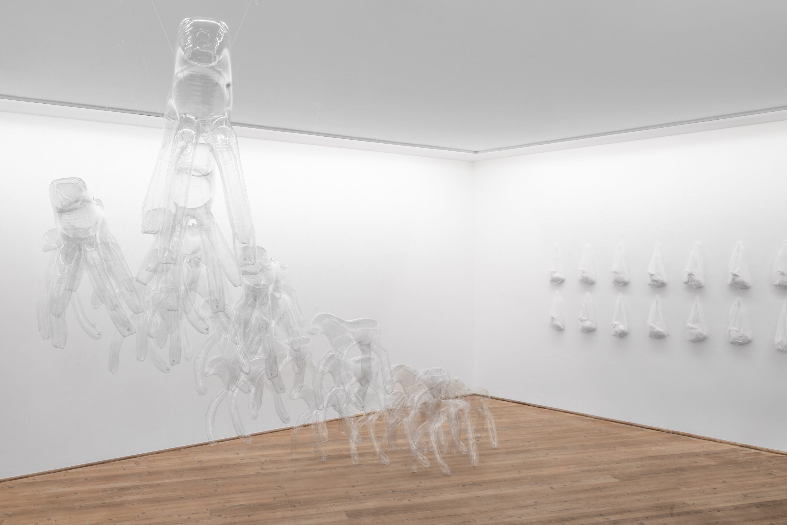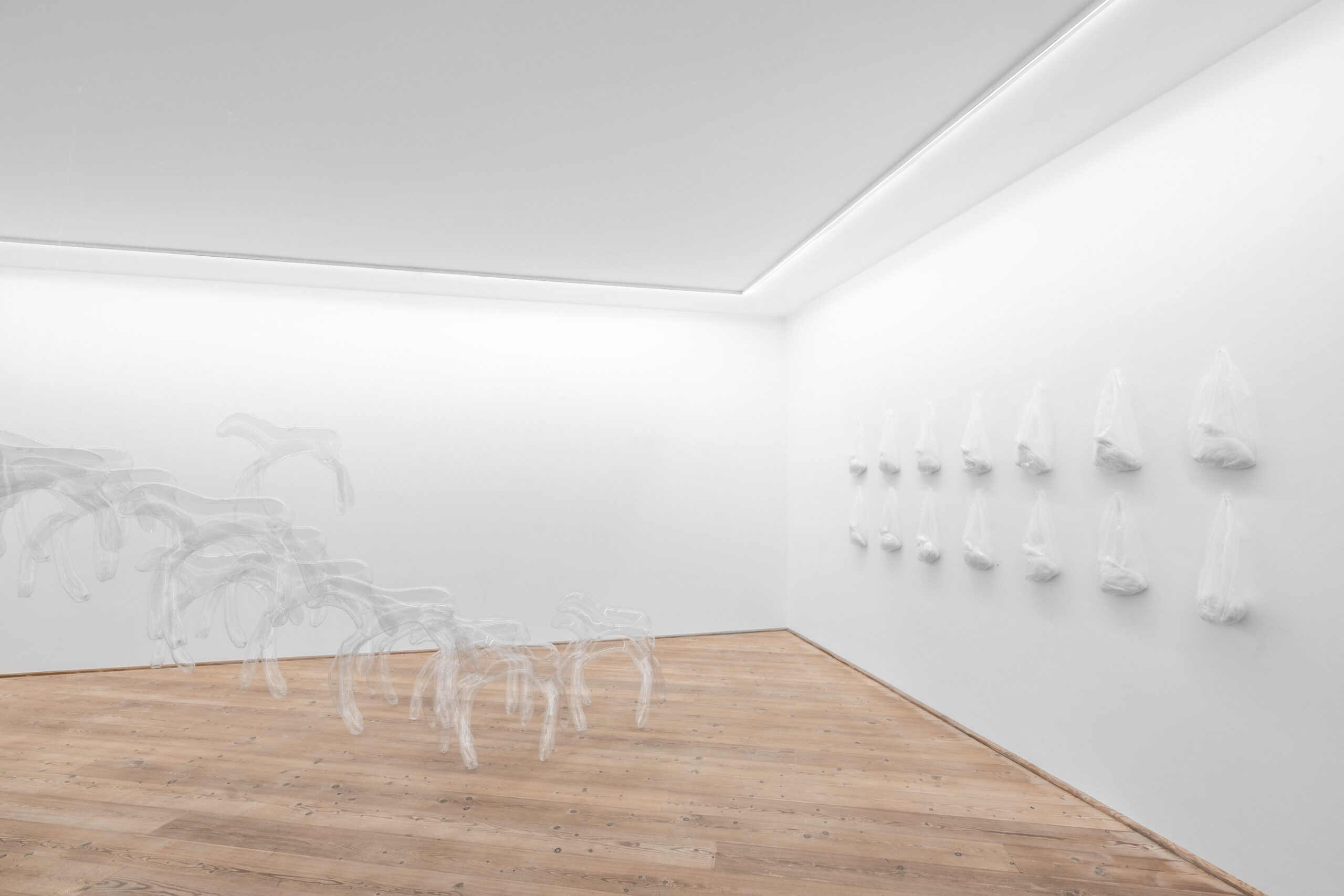 Socio-cultural structures and traditional hierarchies are a questioned in the Herd N°2, a sculptural installation of transparent sky-horses. In Greek mythology, the sky-horses pull the chariot of the god Helios, symbolizing the sun’s passage from east to west, from dawn to dusk—a metaphor for transience. These mythological beings are both present and absent. Their translucent materiality and minimal figurativeness represent their absence in our physical world and their presence in our imagination, myths, and stories.